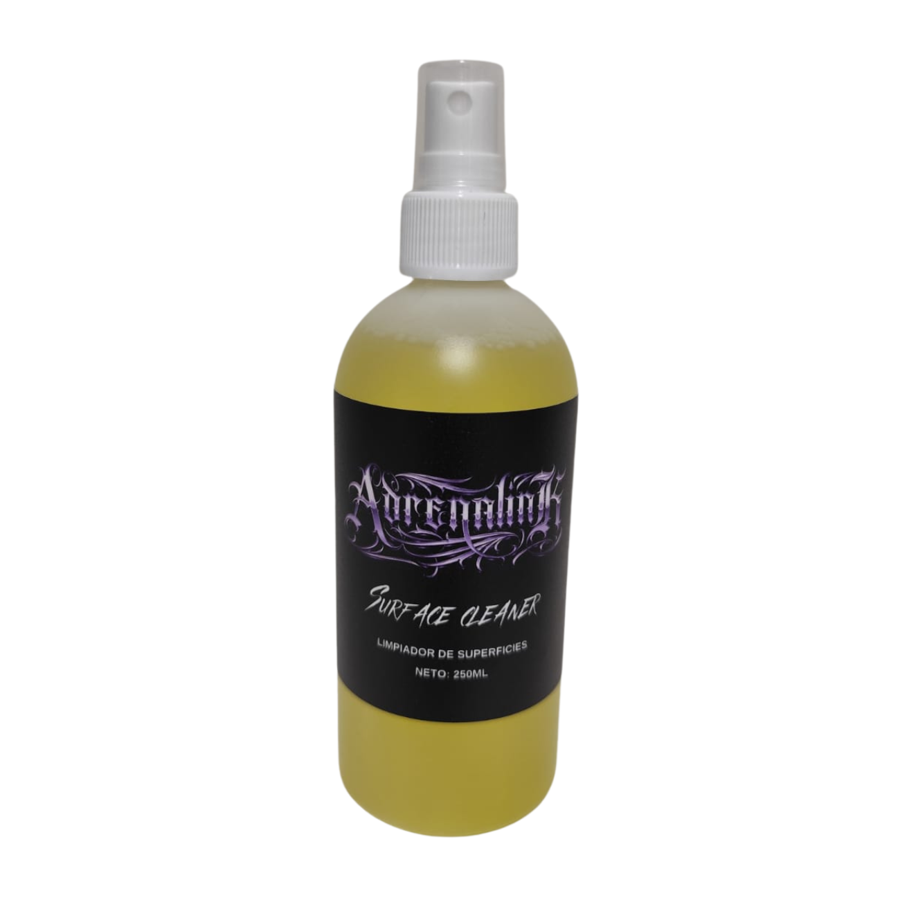 Adrenalink Surface cleaner es un sanitizante de gran poder limpiador para superficies como azulejos, estaciones de trabajo, en general donde el artista tatuador y el cliente requieran un area limpia y libre de contaminación. Su formula permite la remoción de restos de tinta y de lubricantes. Producto vegano y libre de crueldad animal.